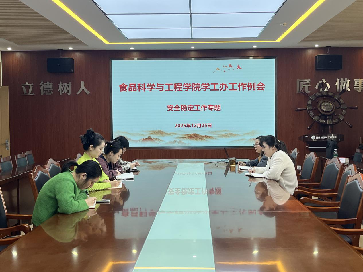 12月25日,食品科学与工程学院召开学工办安全稳定工作会议,会议由学院党委副书记王敬主持,学院全体辅导员参加。