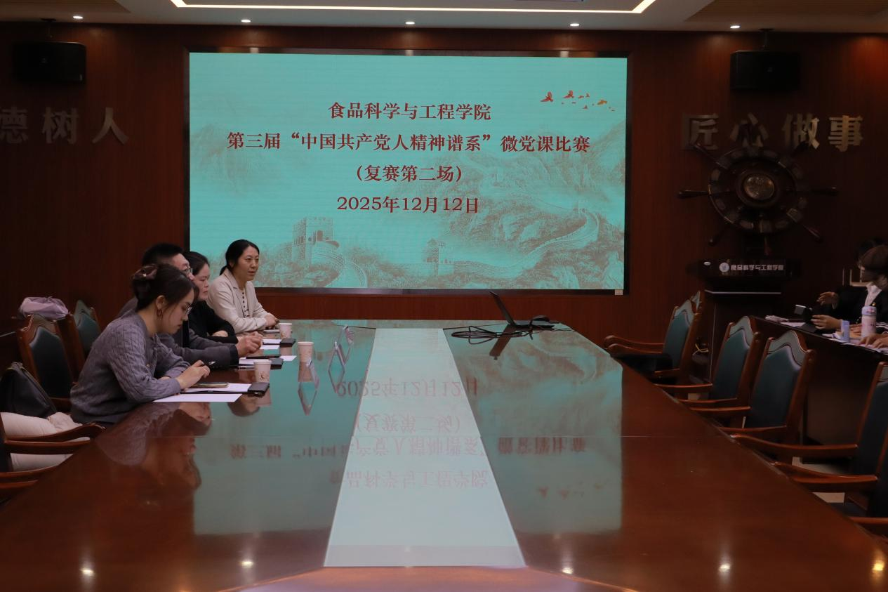 为深化党史学习教育,引导师生党员传承与弘扬中国共产党人精神谱系,食品学院于12月11-12日举办“中国共产党人精神谱系”微党课比赛复赛。本次复赛邀请理学与信息学院团委书记姜程,动漫与传媒学院正科级辅导员李之泓,理学与信息学院学院副科级辅导员李倩,马克思主义学院教师李菲、刘志秀,食品科学与工程学院正科级辅导员江巧宁担任评委。