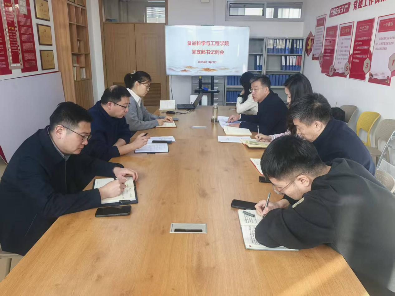 11月27日上午,食品科学与工程学院在食品楼310召开党支部书记工作例会。学院党委班子成员、各党支部书记参加会议,会议由学院党委书记车广杰主持。