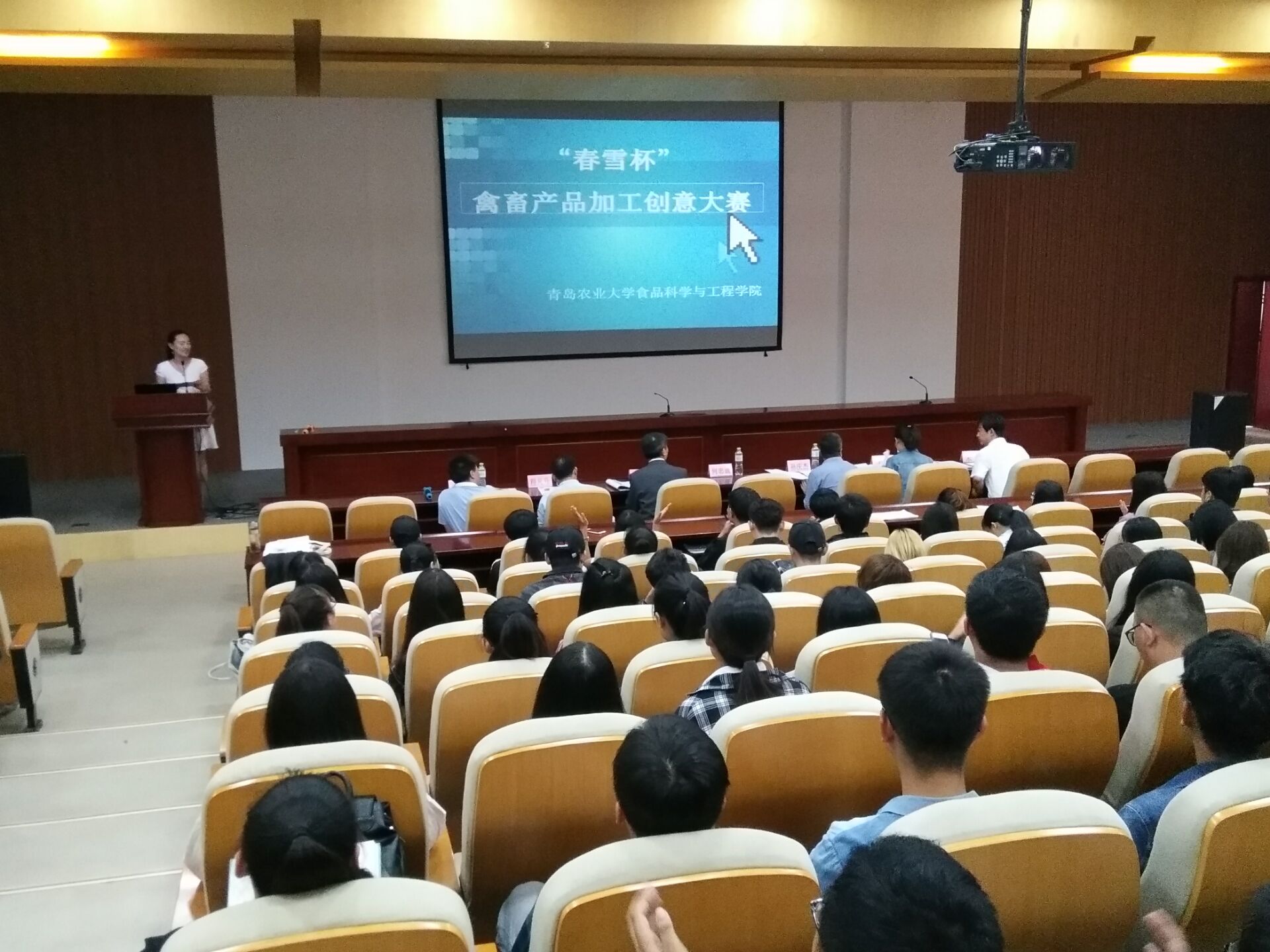 9月29日上午,食品科学与工程学院联合山东春雪食品有限公司共同举办的“春雪杯”禽畜产品加工创意大赛在学术会馆第二报告厅举行。山东春雪食品有限公司研发部徐建祥博士,食品学院党委书记何忠诚、院长王宝维、党委副书记宋伟、副院长孙庆杰、团委书记李永青、生物工程专业负责人谭海刚、农产品加工教研室主任吴昊、葡萄与葡萄酒工程专业负责人程凡升出席大赛并担任评委。
