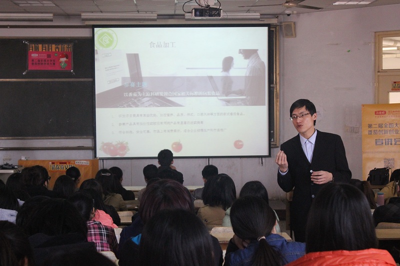 4月8日上午,第二届全国大学生番茄创新创业大赛宣讲会在教学区B404开讲。赛事委员会成员马明博士受邀出席宣讲会并向食品学院大学生介绍了萌番姬杯第二届全国大学生番茄创新创业大赛。 第二届全国大学生番茄创新创业大赛的由方北京医食同源科技有限公司和山东单县人民政府及西南大学和北京农学院共同举办,旨在为大学生创新、创意充分施展提供平台,同时为未来的食品业人才提供一个专业的实践平台,促进有关专业教育更贴近产品、贴近市场、贴近社会,更有效促使学生在创新能力、综合素质等方面得到全面提高。宣讲会开始后,马明博士为在场同学展示了第一届萌番姬杯全国大学生番茄创新创业大赛总决赛的精彩片段和一些创新性科技成果。随后,马明博士对萌番姬杯全国大学生番茄创新创业大赛作了具体的介绍,包括赛事流程、报名方法以及赛事规则,鼓励大家积极参与,寻求创新。本次大赛分为食品加工和萌动天下两个板块,为食品专业和非食品专业的同学都提供了很好的参赛机会。 本次宣讲会,使同学们对萌番姬杯全国大学生番茄创新创业大赛有了更加全面的了解,同时也提高了同学们参与创新的兴趣。希望本次宣讲将能够带动更多的同学参与到创新活动中,提高自身研究、创新能力。