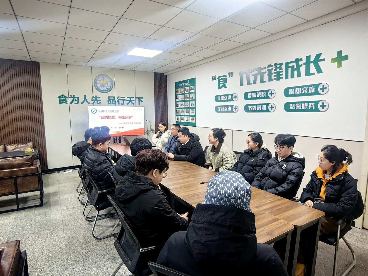 12月23日至24日,食品学院在西苑2号楼“一站式”学生社区举办“食韵启航,师生同行”——“我与院长面对面”座谈会。院长郑金铠分两批与2025级研究生代表围绕“统筹生活与科研,做好研究生阶段规划与管理”主题展开深入交流。