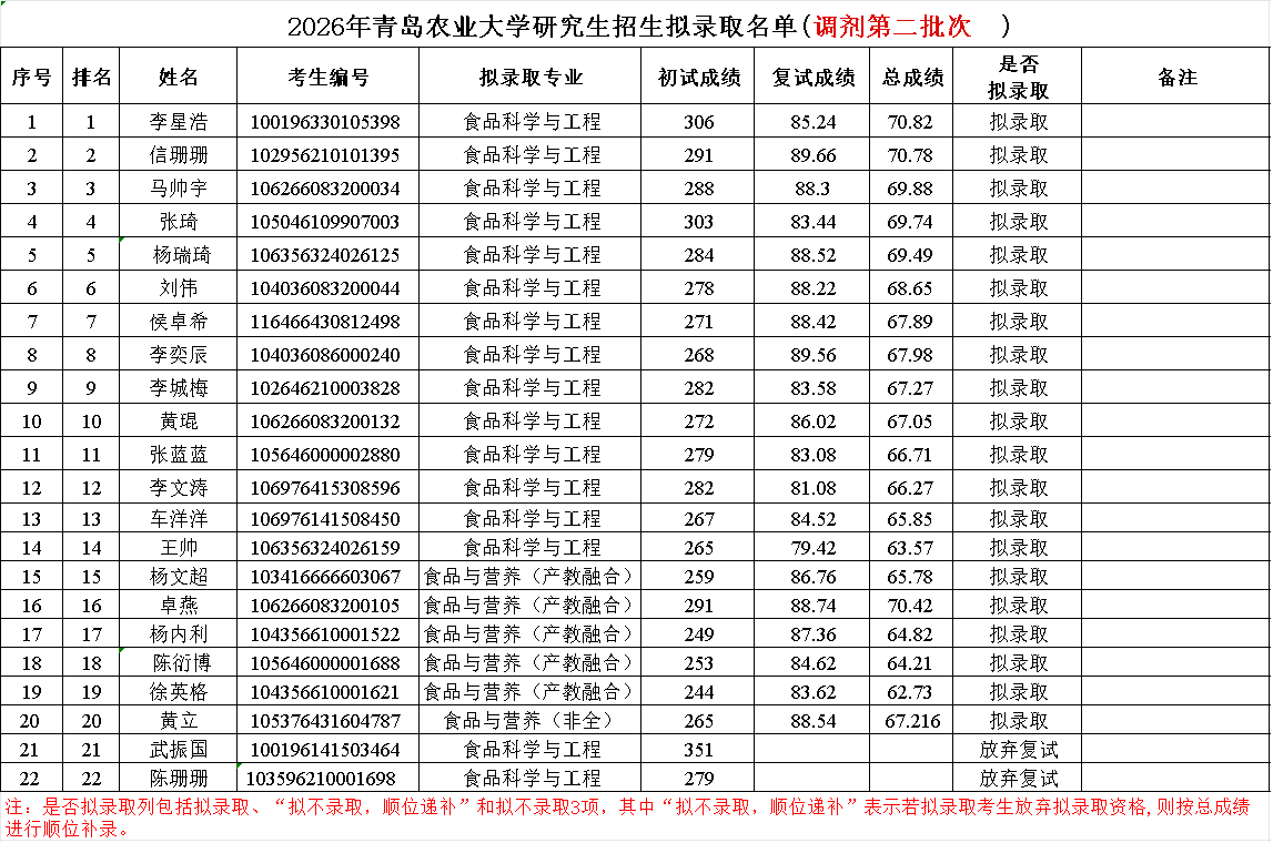 青岛农业大学食品科学与工程学院研究生复试(调剂)第二轮拟录取名单