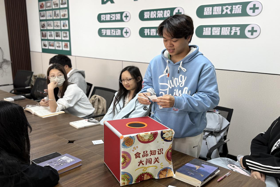 活动伊始,同学们在“食光签到墙”上签名入场。食科2401班陈少鹏同学担任活动主持人,为同学们介绍了世界读书日的由来及活动意义。在读书交流分享环节,同学们自愿登台,限时三分钟分享近期阅读书籍,涵盖专业读物、文学经典、科幻小说及成长励志作品,现场思想碰撞不断。