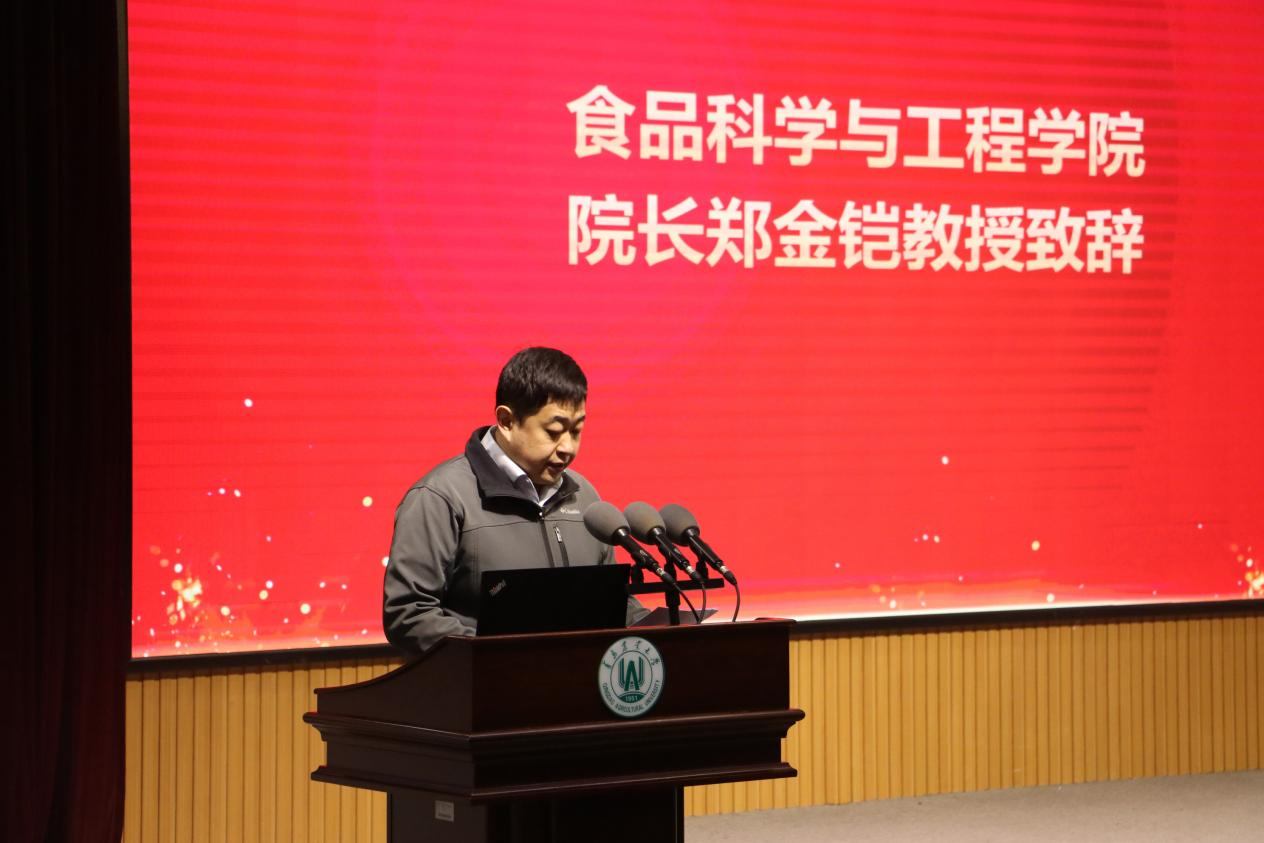 食品学院院长郑金铠致辞,代表学院感谢各位嘉宾以及合作单位对学院建设发展给予的支持和帮助。他表示,食品科技文化节作为学校“十大文化品牌”之一,是学院融通“五育并举”理念、贯穿“三全育人”体系的重要载体,为落实立德树人根本任务、培养高素质应用型人才提供了坚实支撑。他指出,要深化学科内涵建设,持续提升食品科技文化节品牌价值;要深化产教融合,构建产学研用协同发展新格局;要坚持立德树人,引导学生服务国家战略需求,勇担时代使命。