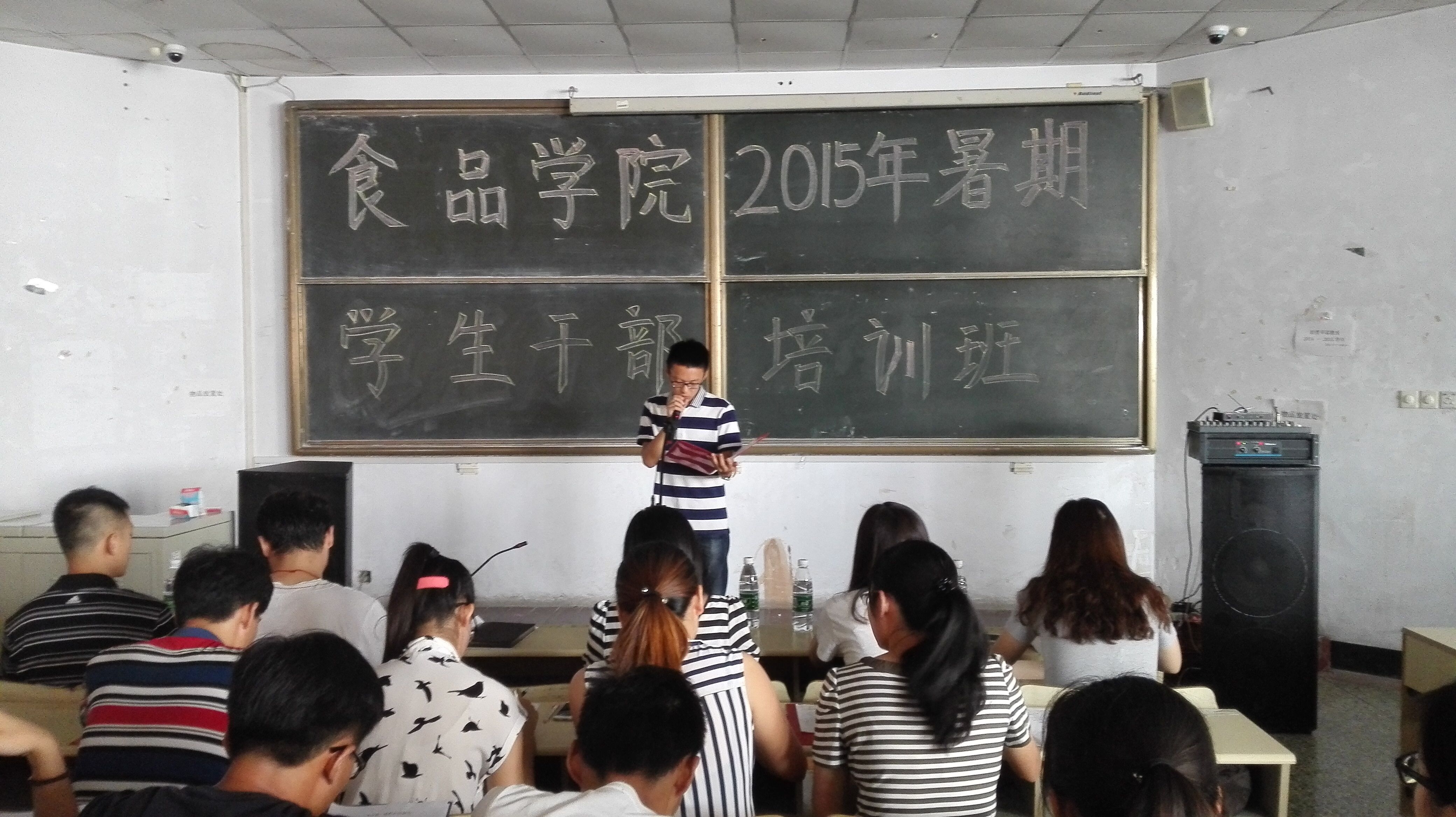 8月22日上午,食品科学与工程学院于教学区开展“2015暑期学生干部培训暨22届学生会述职报告会”。食品学院党委副书记王乾,团委书记王海霖以及学工办辅导员老师出席,学生会全体成员以及各班班委参加了本次培训班。