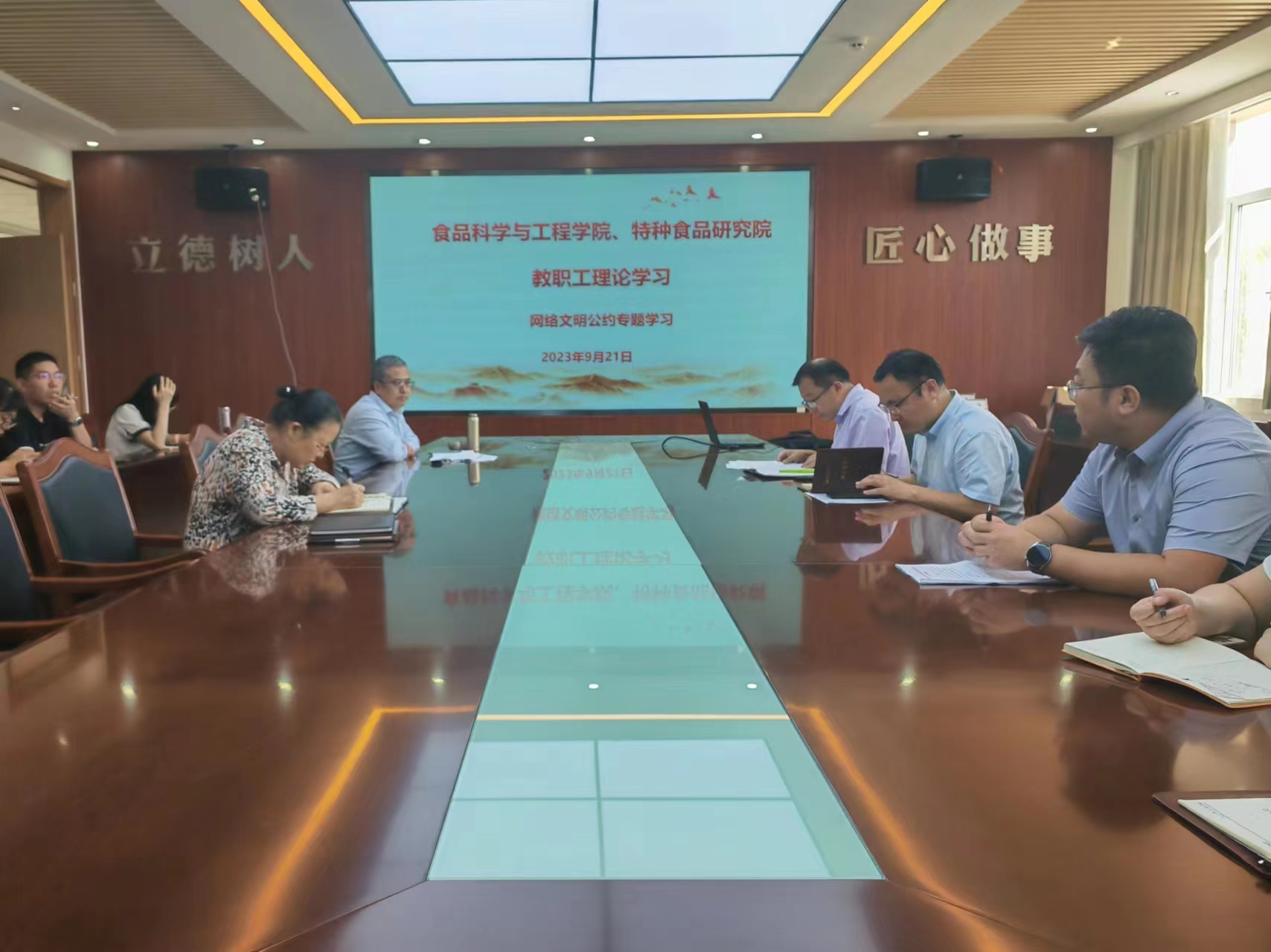 9月21日,食品科学与工程学院、特种食品研究院召开教职工理论学习会议,学习《青岛市教育系统师生员工网络文明公约(试行)》、关于2023年中秋、国庆廉洁提醒的通知,会议由学院院长孙庆杰主持。