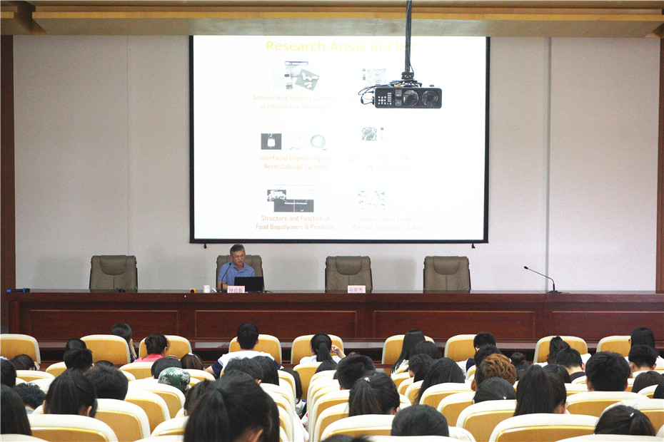 在报告中,钟启新教授介绍了美国田纳西大学的基本情况及食品科学系的研究领域,介绍了其所在团队的研究方向,包括食品大分子的结构与功能,功能食品因子配料技术、天然抗菌剂的配料技术等。他鼓励在场学生树立目标、不断创新、敢于尝试,并欢迎大家到田纳西大学深造。最后,钟教授和现场师生进行亲切互动,回答了师生们的问题。