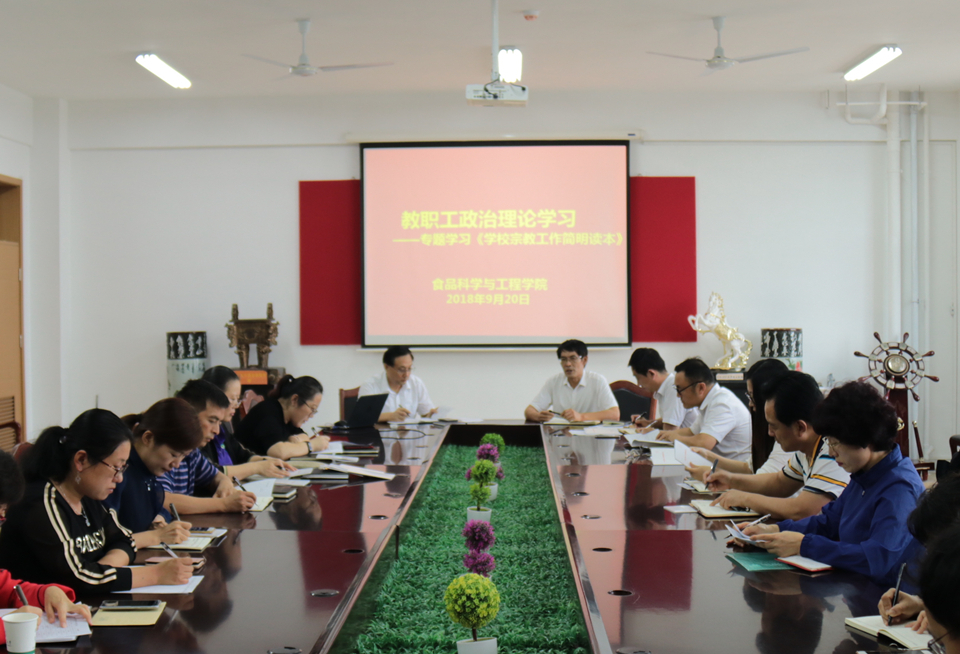 9月21日下午,食品科学与工程学院在食品楼310会议室开展教职工政治理论学习。会议由学院党委书记何忠诚主持。