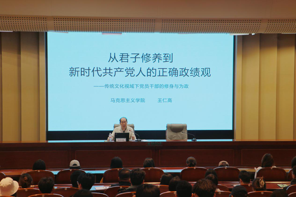 本次报告会以“从君子修养到新时代共产党人的正确政绩观——传统文化视域下党员干部的修身与为政”为主题。王仁高以孔子“为政以德”的政治德行原则为切入点,系统梳理了中华优秀传统文化中“修身立德、为政以仁”的思想脉络,深入阐释了传统君子修养与新时代共产党人正确政绩观的内在关联与时代发展。结合具体案例,详细解读了正确政绩观的核心要义与实践要求。他强调,学生党员和干部应积极从优秀传统文化中汲取修身智慧,坚定理想信念,锤炼务实作风,在日常学习、班级管理及学生组织工作中坚持实事求是、主动担当作为。