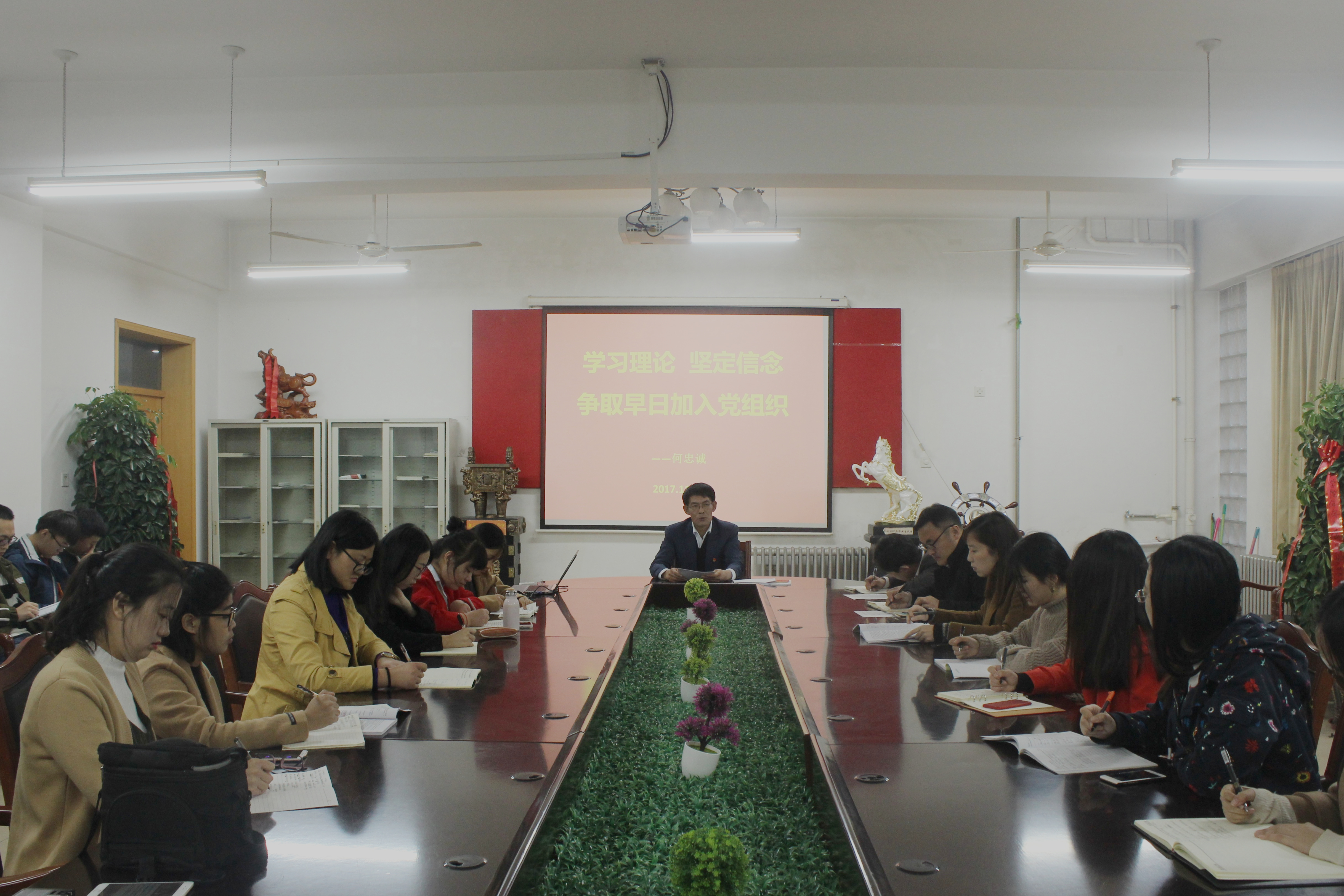 11月8日下午,食品科学与工程学院党委书记何忠诚在化学楼207会议室为本期党员发展对象和入党积极分子作主题为“学习理论、坚定信念,争取早日加入党组织”的专题党课辅导报告。学院党委副书记宋伟、团委书记李永青、辅导员赵莹出席报告会。