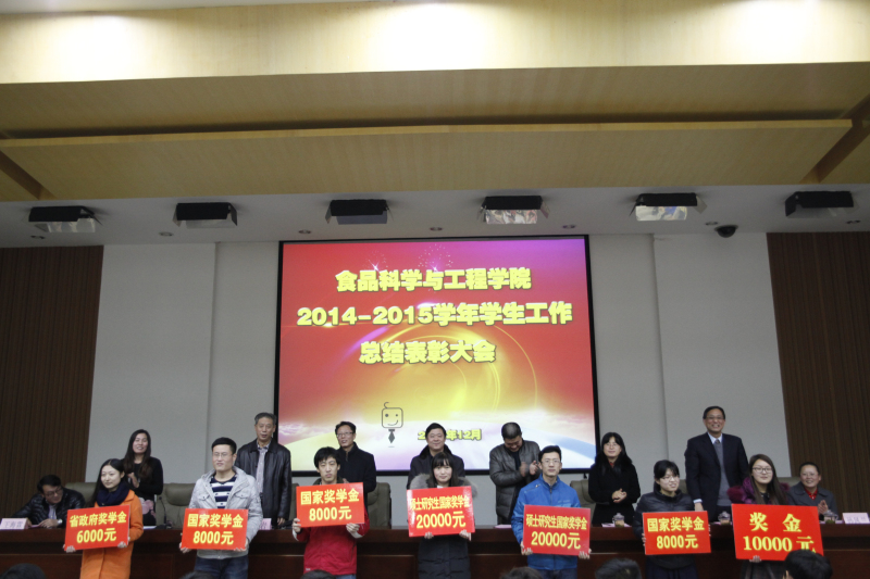 在庄严雄壮的国歌声中大会正式开始。食品学院党委书记史岩教授首先做2014—2015学生工作总结报告。报告主要从以下几个方面总结了学院一年来学生工作情况,一是深入贯彻十八大精神,创新大学生思想政治教育工作形式,加强党团组织建设;二是注重宿舍管理,推进学风建设,关注学生心理健康,保障安全稳定,不断夯实学生工作基石;三是积极开展各类活动,打造科技创新实践平台,促进学生全面发展;四是加强教育,强化引领,积极推进特色学生工作“微笑在行动”、“星级宿舍”等品牌建设。史岩指出,一年来在学校党委、行政的正确领导下,学院全面贯彻落实十八大精神和“三严三实”专题教育活动要求,围绕特色名校建设这一中心,深入开展学生工作。在全体学生工作人员的共同努力和在全院师生的通力配合下,学院学生工作取得了优异的成绩。学院被评为2015年度“共青团工作先进集体”、“学生发展指导工作先进学院”、“第八届读书活动月优秀组织单位”、“第十一届大学生心理健康节优秀组织单位”、“阳光体育优秀组织单位”等荣誉称号。在表彰先进,总结经验的同时也要正视自身的不足与差距:一是要加强学生工作的理论研究;二是要继续凝练学生工作品牌;三是加强制度化建设,推进学风建设和宿舍管理等方面的精细化管理。 随后,食品学院院长王宝维宣读《关于表彰先进集体先进个人的决定》,并向获奖的集体、个人给予热烈的祝贺与鼓励。优秀班主任代表陈海华老师讲述了自己做好班级工作的经验与心得;山东省先进班级学生代表王燕,“校十佳大学生”、国家奖学金获得者倪永升、全国挑战杯总决赛三等奖团队代表冯寒青分别就班级建设、学习经验、大学生科技创新等方面进行了经验分享交流。最后,出席大会的领导老师为荣获2014-2015年度国家奖学金、优秀学生奖学金、先进班级体、星级宿舍、优秀学生干部、国家级创业大赛奖项等荣誉的先进集体和先进个人进行颁奖。