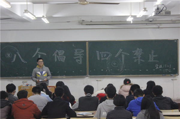 “八倡四禁”主要内容包括:倡导尊师重教;倡导诚信考试;倡导课堂守纪;倡导交通守则;倡导爱护环境;倡导节约用电;倡导文明交往;倡导文明着装;禁止践踏草坪;禁止乱涂乱画;禁止餐进教室;禁止乱扔垃圾,是符合社会主义核心价值观要求的大学生行为准则。在本次政治学习中,食科1401班主讲人仲杰用孔子和颜回的故事讲述了尊师重教的重要性;葡萄1502班管羽青倡导道:“作为大学生的我们要严于律己,努力践行‘八个禁止,四个倡导’的具体要求,努力做一个行为规范,品学兼优的大学生。”学习过后,全体同学还以班级为单位签署了“八倡四进”承诺书,承诺从自身做起,严格践行“八倡四进”,做文明大学生。