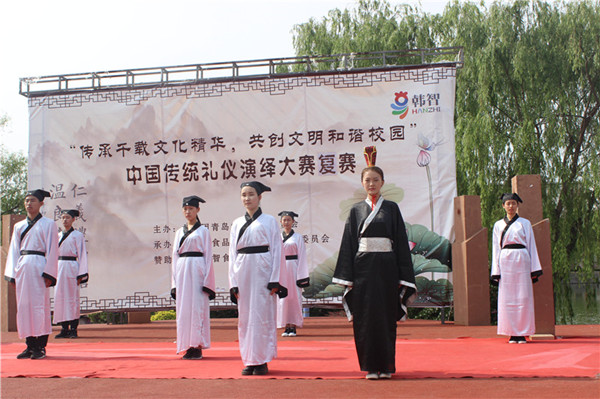 5月14日,为继承中国传统文化,弘扬中华传统礼仪,食品科学与工程学院于知音广场举办了第十一届科技文化艺术节系列活动——“传承千载文化精华,共创和谐文化校园”中国传统礼仪演绎大赛复赛。此次比赛共有来自学校各学院的18支代表队参加。比赛特邀校美丽女生辅导员工作室指导教师赵莹,食品学院兼职辅导员田晓英,大学生艺术团团长曹玉涵,校文明礼仪培训部部长蒋欢以及汉韵社社长张雨晴担任评委。据了解,本次比赛分为传统礼仪演绎和传统文化知识问答两部分,由评委进行综合打分,取平均分决定成绩排名,最终排名前十的学院代表队进入决赛。