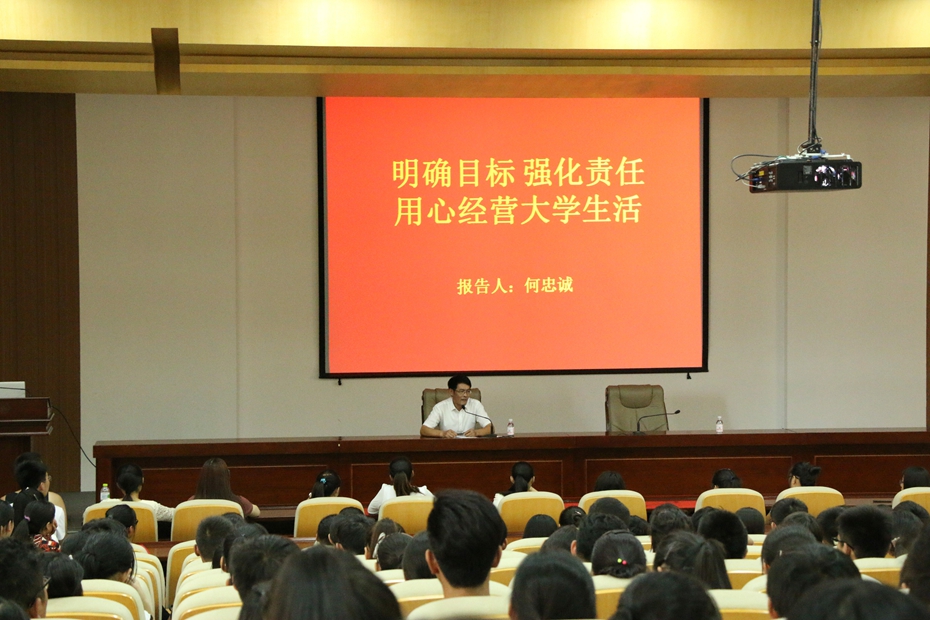 报告中,何忠诚结合社会要求、家庭学校期盼和在校大学生存在的的一些问题,运用大量案例,从当代大学生如何成功度过大学四年出发,着重从“发展、责任、修养、安全”四个方面与2016级新同学分享了自己对大学生活的看法,同时对2016级新同学们提出了一些希望和要求:一是求发展,不断提升社会竞争力。在校期间,希望同学们尽快确立学业目标、职业目标和人生目标,及早做好包括大学生涯在内的职业生涯发展规划,有目的地涉猎知识、培养能力,使自己的知识能力结构和水平更好的适应未来职位分析下的任职资格能力要求。要做到:端正学习态度,培养学习能力;慎重对待课程选修和能力培养;经营管理好自习时间;坚持做快乐有意义的事;既要树立创业梦想、又要慎重启动创业之旅;要有吃苦耐劳、永不言弃的精神。二是有责任,不断提升自我管理能力。希望年轻大学生们真正做到富有责任、敢于担当、适应环境、追求完美。三是讲修养,不断提升修身正己能力。大学生加强文明修身要做到加强品德修养、强化看齐意识、加强情商培养、养成良好行为习惯、慎重结交朋友、善于搞好团结、善于沟通交流、善于乐于助人、守纪律讲规矩、正确理解个性发展。四是重安全,不断提升自我防范能力。何忠诚强调,安全稳定是同学们一切学习、工作和生活的基础,希望大学生们要时刻注意人身、财物、饮食、交通、实验室安全,要学会控制自己情绪,要时刻保持警醒头脑、谨防被他人利用,确保自己安全顺利的度过大学四年。