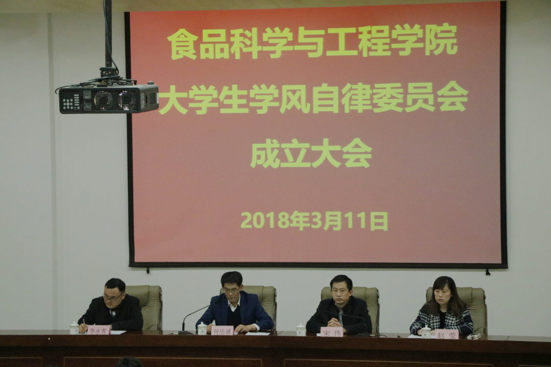 李永青宣读了《食品科学与工程学院大学生学风自律委员会条例》。赵莹宣读了第一届大学生学风自律委员会成员名单。第一届大学生学风自律委员会主席王爱霞作为学生代表做了发言。