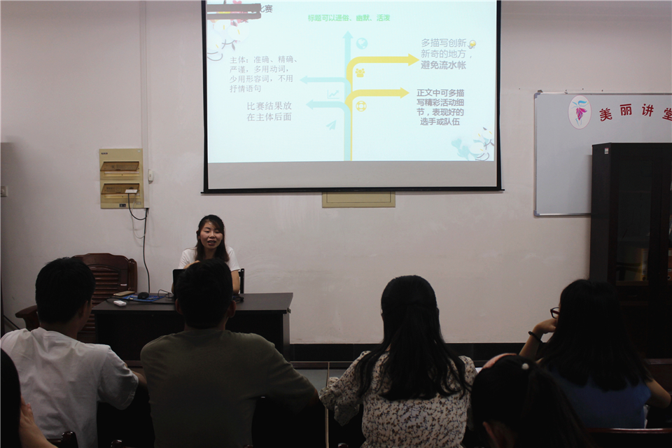 新闻部部长刘淑珍结合新闻写作实例,就如何写好一篇新闻进行讲解,她提到:新闻写作的目地是让读者通过文字能了解发生的事件,一篇好的新闻应篇幅适中不累赘,语言官方不随意,用词严谨准确无误。并对新闻写作中经常出现的问题进行强调,鼓励大家多看多写多锻炼,提高新闻写作能力。