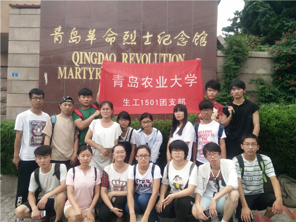 炎热的夏日,碧绿的山岗,迎来了一群热血的青年,庄重的气氛,肃穆的眼神,真挚的鞠躬。为了响应六部门学党史工作的号召,提高学生整体素质,青岛农业大学食品科学与工程学院生物工程1501团支部成员参加了以“忆红色经典,筑中国之梦”为主题的暑期社会实践活动。18名支部成员于2016年7月12日奔赴青岛市革命烈士纪念馆进行参观学习,共同追忆那段峥嵘岁月,深刻锤炼学生热血青春。