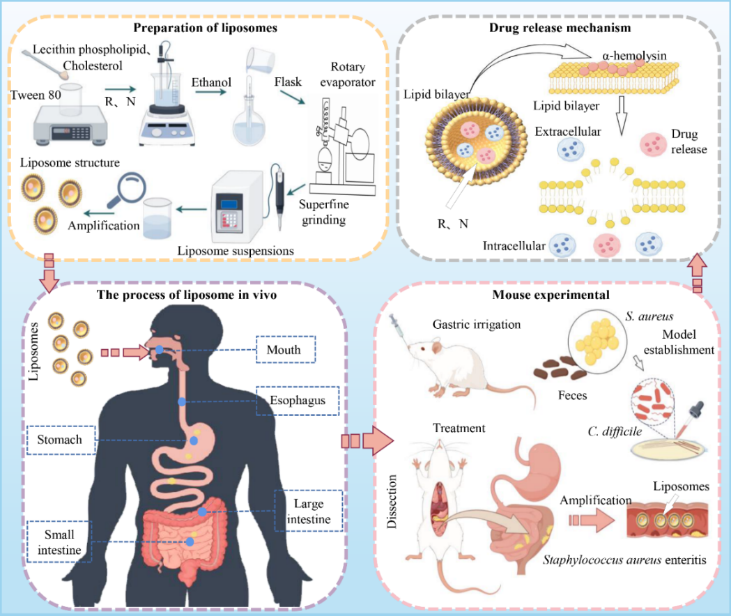 近日,青岛农业大学食品科学与工程学院鞠健教授团队在国际权威期刊《Materials Today Bio》(一区,TOP,IF=10.2)在线发表题为《Establishment and Application of Nano-liposomes System for Targeted Therapy of Methicillin-resistant Staphylococcus aureus Enteritis》的文章,创建了一种新型靶向治疗金黄色葡萄球菌肠炎的纳米运载体系。