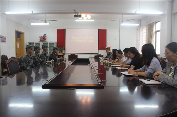 9月2日下午,食品学院2015级新生军训教官在化学楼会议室受到食品学院领导老师的热烈欢迎。食品学院党委党委副书记王乾及学工办成员、班主任代表与四位教官见面交流。 会上,王书记首先向教官们介绍了学院新生情况及历年军训情况,希望各位教官们能够将部队上良好的传统作风传递给新生,在保证军训安全的前提下培养他们吃苦耐劳、服从指挥的精神,养成团队合作的意识观念。同时,也要加强新生国防教育,增强新生国防意识。由于学院新生多,教官训练任务艰巨,王书记希望双方应及时沟通,并表示学院一定会积极配合教官做好军训工作。随后,各位领导老师与教官就各方面工作做了进一步交流。
