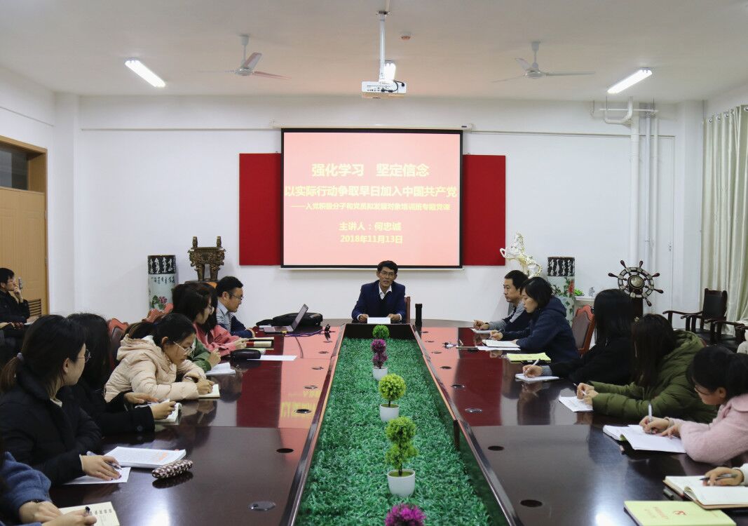 11月13日,食品科学与工程学院党委书记何忠诚为2018年下半年党员拟发展对象和第23期入党积极分子作主题为“强化学习 坚定信念 以实际行动争取早日加入中国共产党”的专题党课辅导报告。学院党委副书记宋伟、团委书记李永青,辅导员赵莹出席报告会。