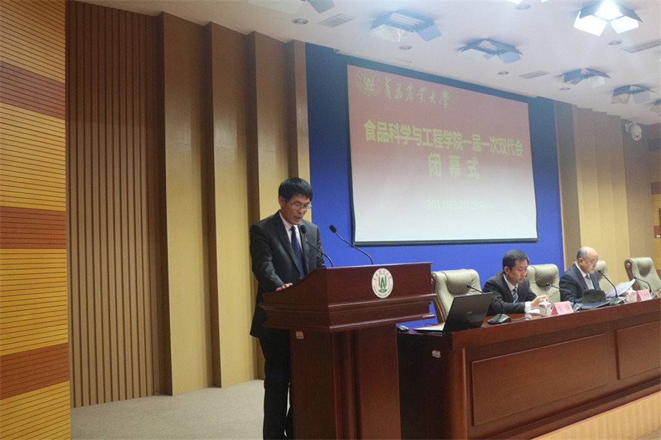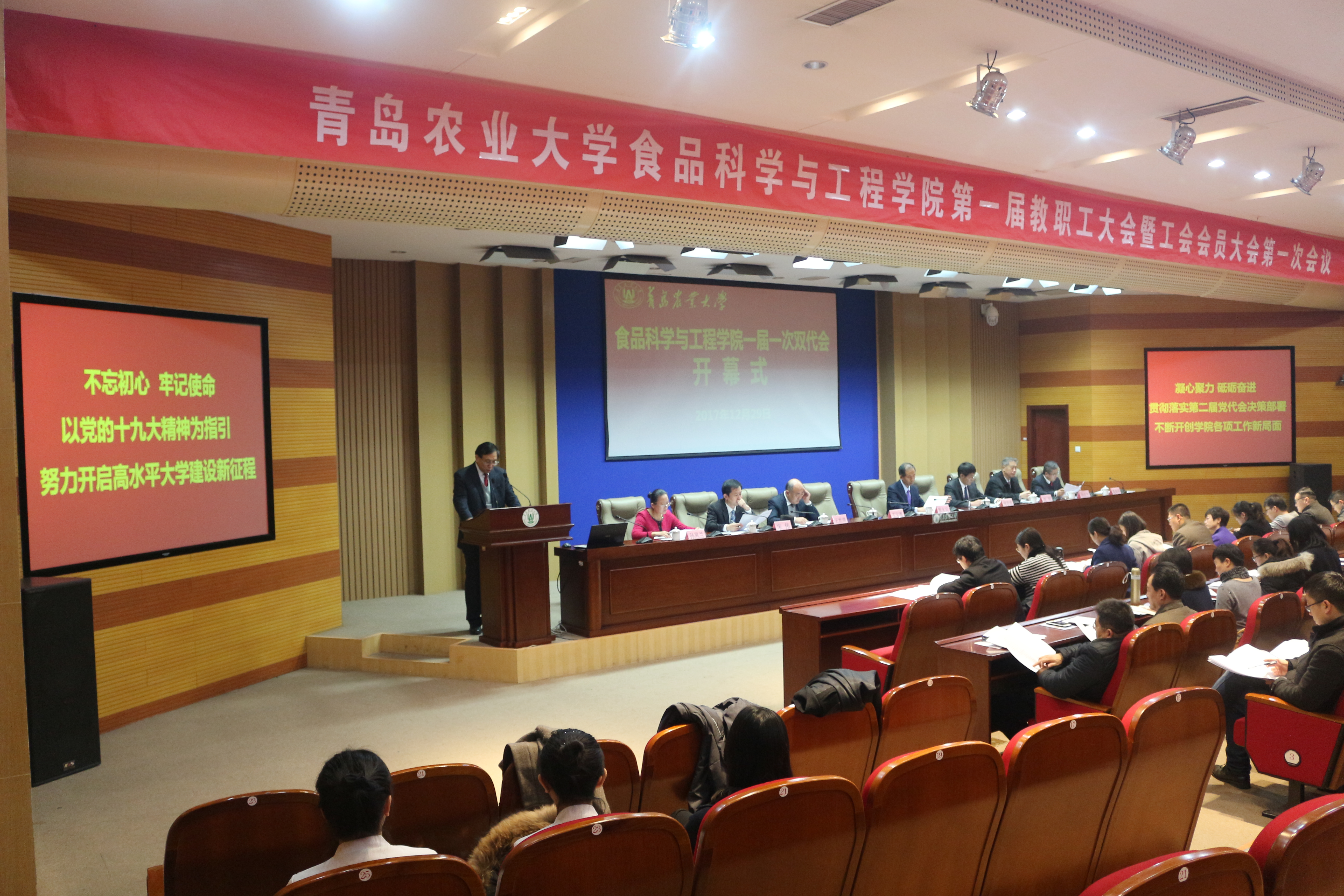 12月29日,青岛农业大学食品科学与工程学院在学术会馆第一报告厅召开第一届教职工大会暨工会会员大会第一次会议。学院分管校领导、副校长原永兵受邀出席大会。学院退休老领导、老教师史岩作为特邀代表出席本次会议,学院全体教职工和工会会员参加大会。会议由学院党委书记何忠诚主持。