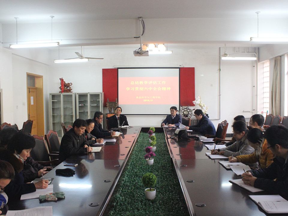 11月25日上午,食品科学与工程学院在化学楼207会议室举行十八届六中全会精神学习暨本科教学审核评估工作总结会,学院全体教师与会。会议由学院党委书记何忠诚主持。