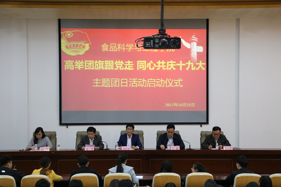 10月22日下午,食品科学与工程学院于学术会馆第二报告厅举行“高举党旗跟党走,同心共庆十九大”主题团日活动启动仪式。青岛农业大学团委书记王峰、学院党委书记何忠诚、党委副书记宋伟、团委书记李永青、正科级辅导员赵莹出席启动仪式。学院团员代表300余人参加了启动仪式。仪式由宋伟主持。