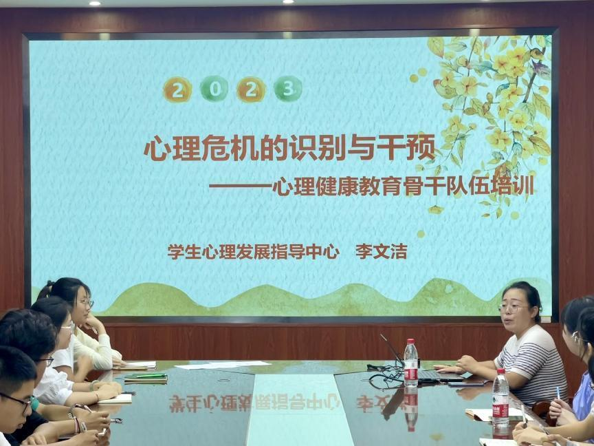 学生心理发展指导中心李文洁老师,针对大学生心理危机的识别与干预对学生干部们进行辅导。从心理危机的类型、识别方法以及如何帮助同学们度过心理危机三个方面系统阐述,提出学生干部应正视心理问题,有耐心、多倾听,保持冷静,表达关心。