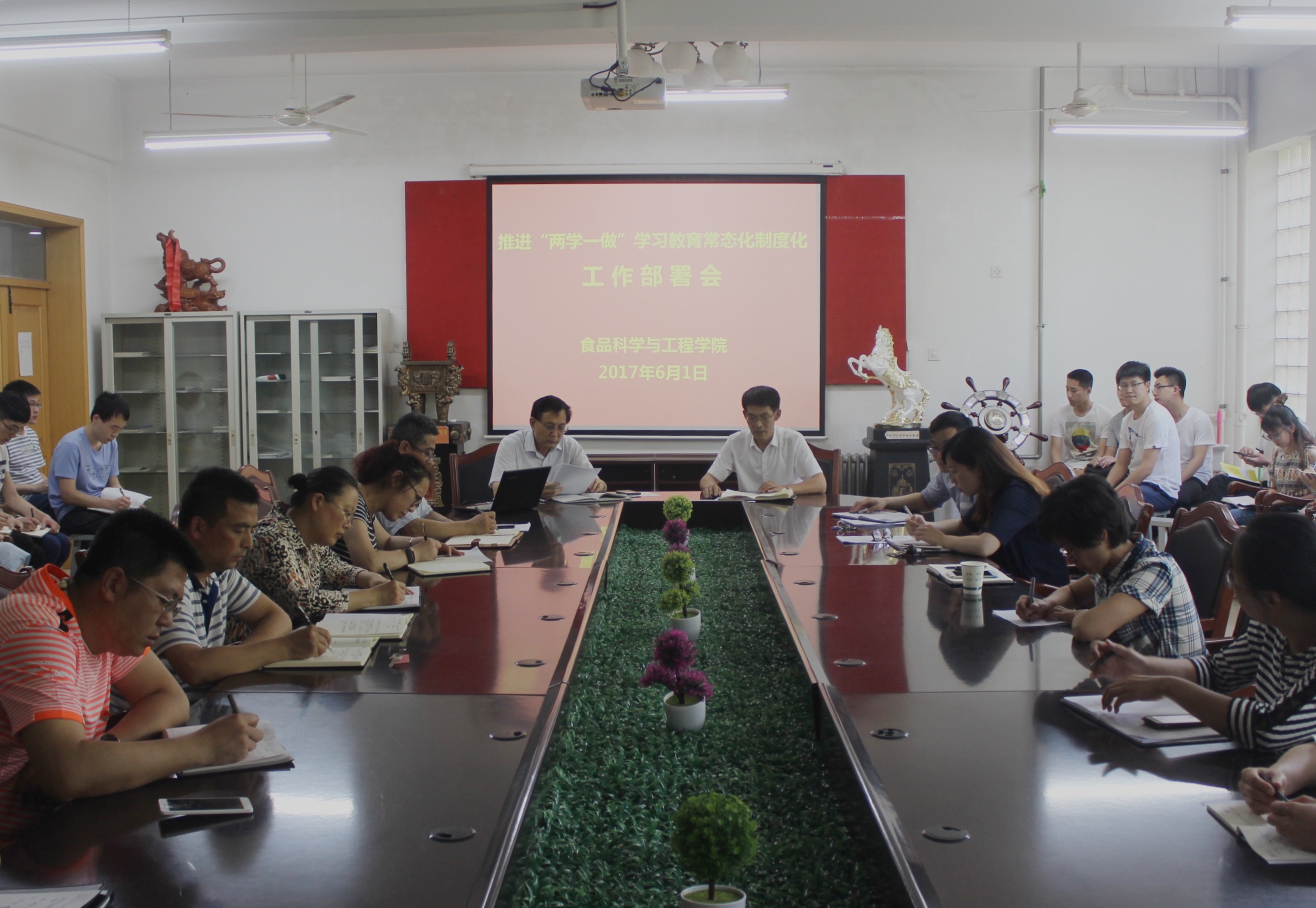 6月1日下午,食品科学与工程学院在化学楼207会议室召开推进“两学一做”学习教育常态化制度化工作部署会,学院师生党员参加会议。会议由学院党委书记何忠诚主持。